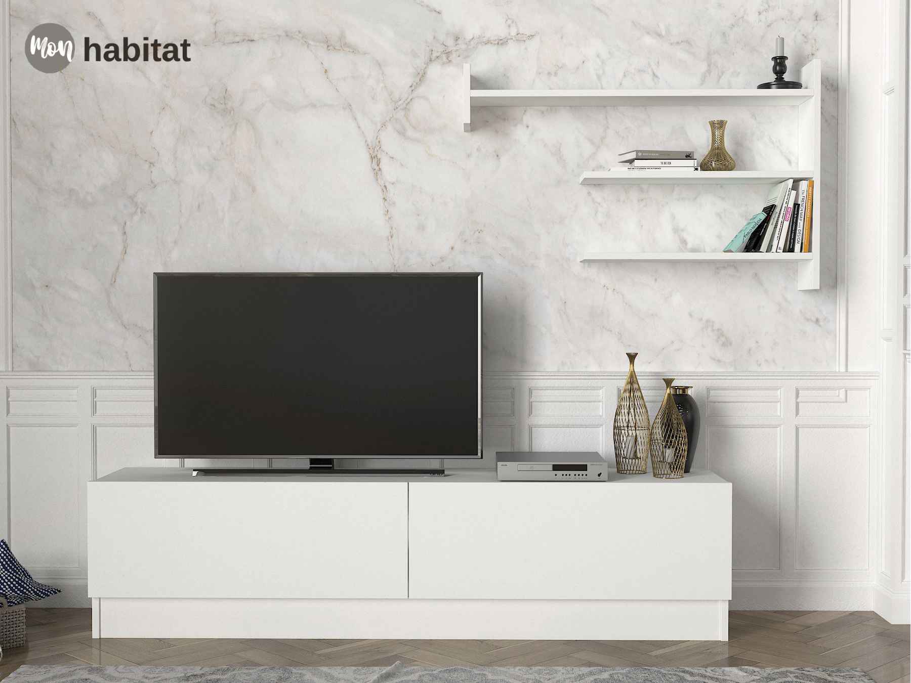 Le meuble TV Alvario séduit par son design minimaliste et sa finition blanche moderne. Idéal pour un salon épuré, il dispose de rangements spacieux pour organiser votre espace avec style. Un meuble fonctionnel qui mise sur l'essentiel : la beauté et la praticité.